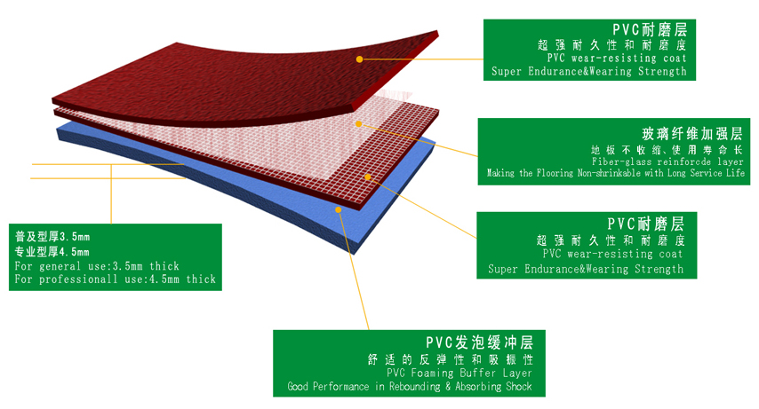 PVC運(yùn)動(dòng)地板是各類室內(nèi)球館運(yùn)動(dòng)場地的最佳選擇。與實(shí)木運(yùn)動(dòng)地板相比,其具有更好的安全性、減震性以及反彈性能。另外,PVC運(yùn)動(dòng)地板安裝方便,其中可移動(dòng)性運(yùn)動(dòng)地板還可以滿足客戶做移動(dòng)場地這一特殊要求。